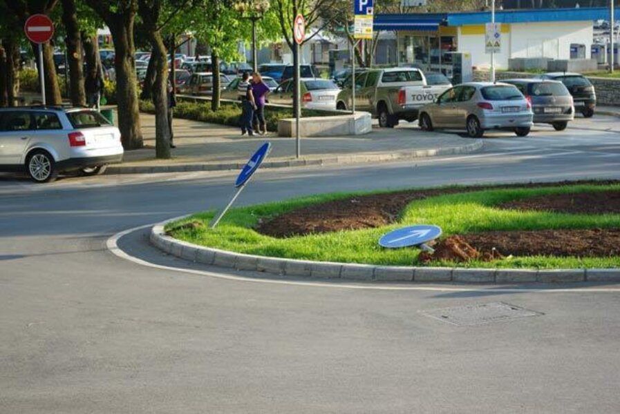 Rotore na početku gradske rive i na dnu Vlašićeve pohodili su opet oni kojima je normalan prolazak kroz njih nedokučiva vještina, pa su nastradali prometni znakovi koji cijelog ponedjeljka leže kao pokošeno cvijeće.