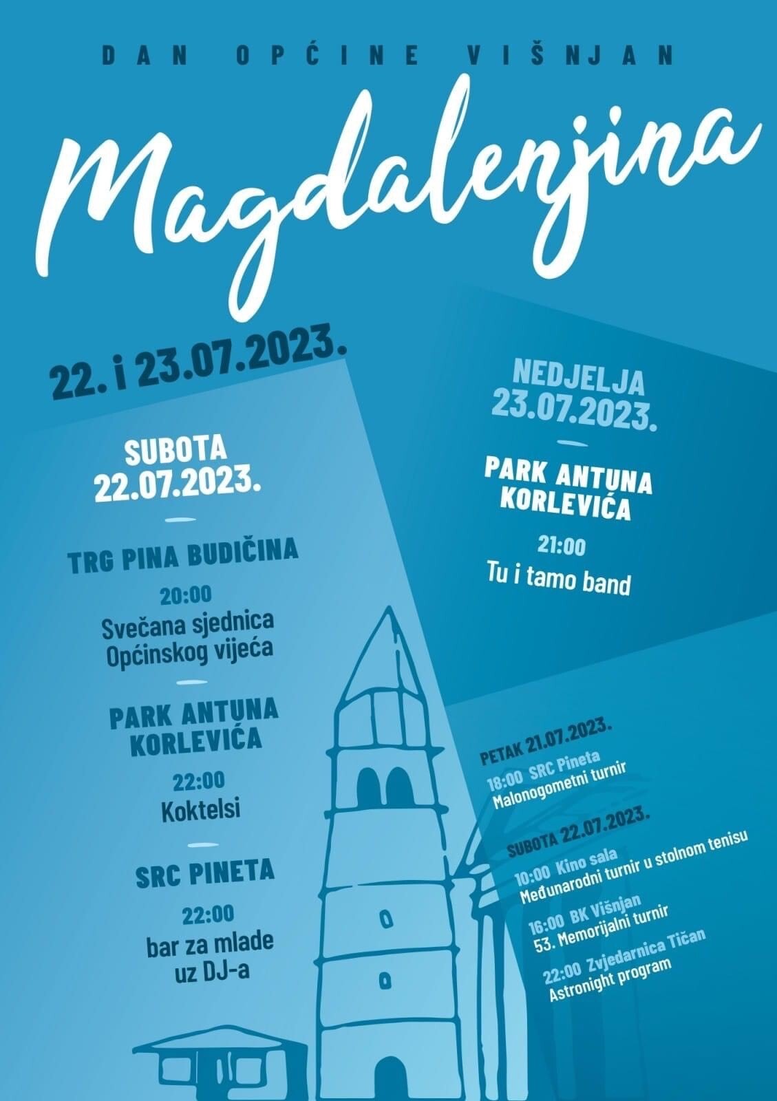 Općina Višnjan slavi svoj Dan Općine i Magdalenjinu 22. i 23. srpnja. Program ovogodišnjih svečanosti uključuje razne sportske, kulturne i zabavne događaje.