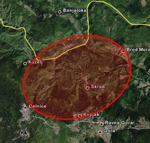 Glavnina meteoritske mase ~20 kg u fragmentima pala je na područje