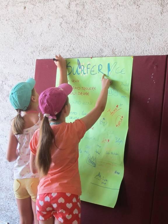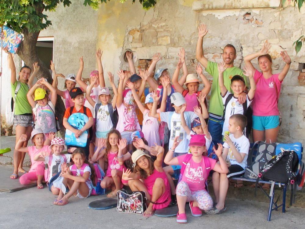 Prvi dan je prošao u upoznavanju, kupanju i zabavi. Djeca su svojim grupama izabrala imena: Račići, Delfinići i Surferi/ce. Od jutra su na moru, a za sobom su ostavili baze u kojima su već vidljivi njihovi kreativni tragovi.