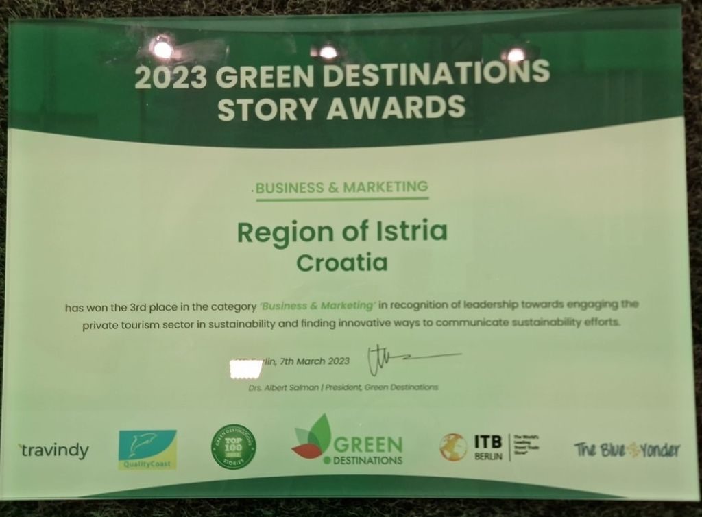 Istarska županija može se pohvaliti još jednim uspjehom u području održivog turizma. Projekt Eco Domus, koji je pokrenuo županijski Upravni odjel za turizam 2017. godine, osvojio je treće mjesto u kategoriji "Business & Marketing" na Green Destination Story Awards dodjeli nagrada, koja se održava na najvećem svjetskom sajmu turizma ITB Berlin. U finalu su uz Istru bile destinacije iz SAD-a, Kanade, Meksika i Švedske.